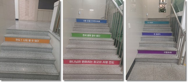 교회계단, 회사계단 이든 공간에 이렇게 포맥스로 알림을 문구로 디자인하여